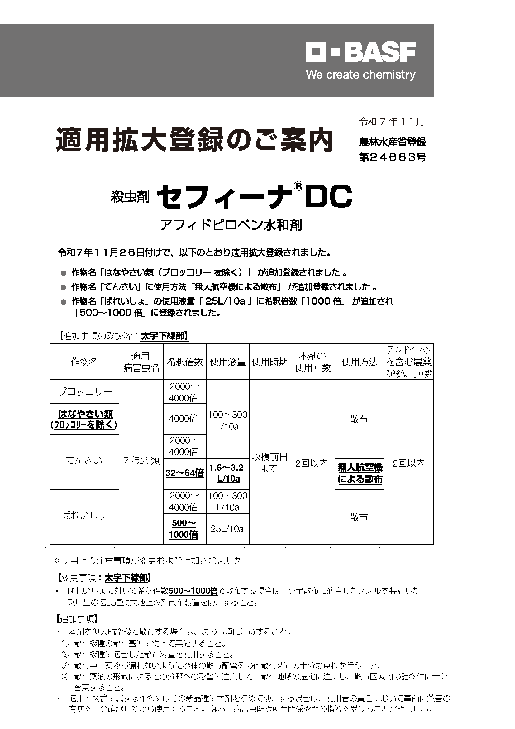 【殺虫剤】第 18500号 カスケード乳剤: 作物名「小粒核果類/ケムシ類」に希釈倍数「4000倍」追加、「茶」の適用病害虫名「チャトゲコナジラミ」追加、「ブロッコリー」の適用病害虫名「コナガ」追加、および「だいず/カメムシ類」の使用方法「無人ヘリコプターによる散布」を「無人航空機による散布」に変更。